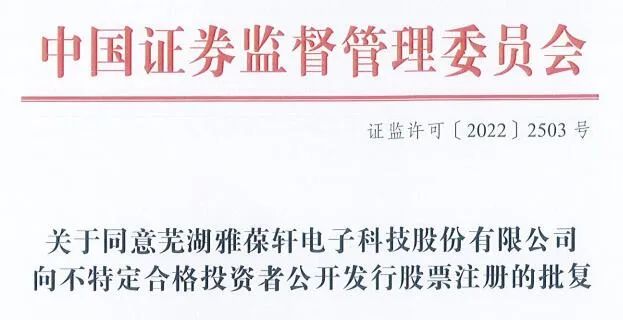 据了解,芜湖雅葆轩电子科技股份有限公司上市申报材料于6月30日获北交所受理,9月28日过会,10月11日提交注册,10月18日获证监会注册,拿到发行批文。