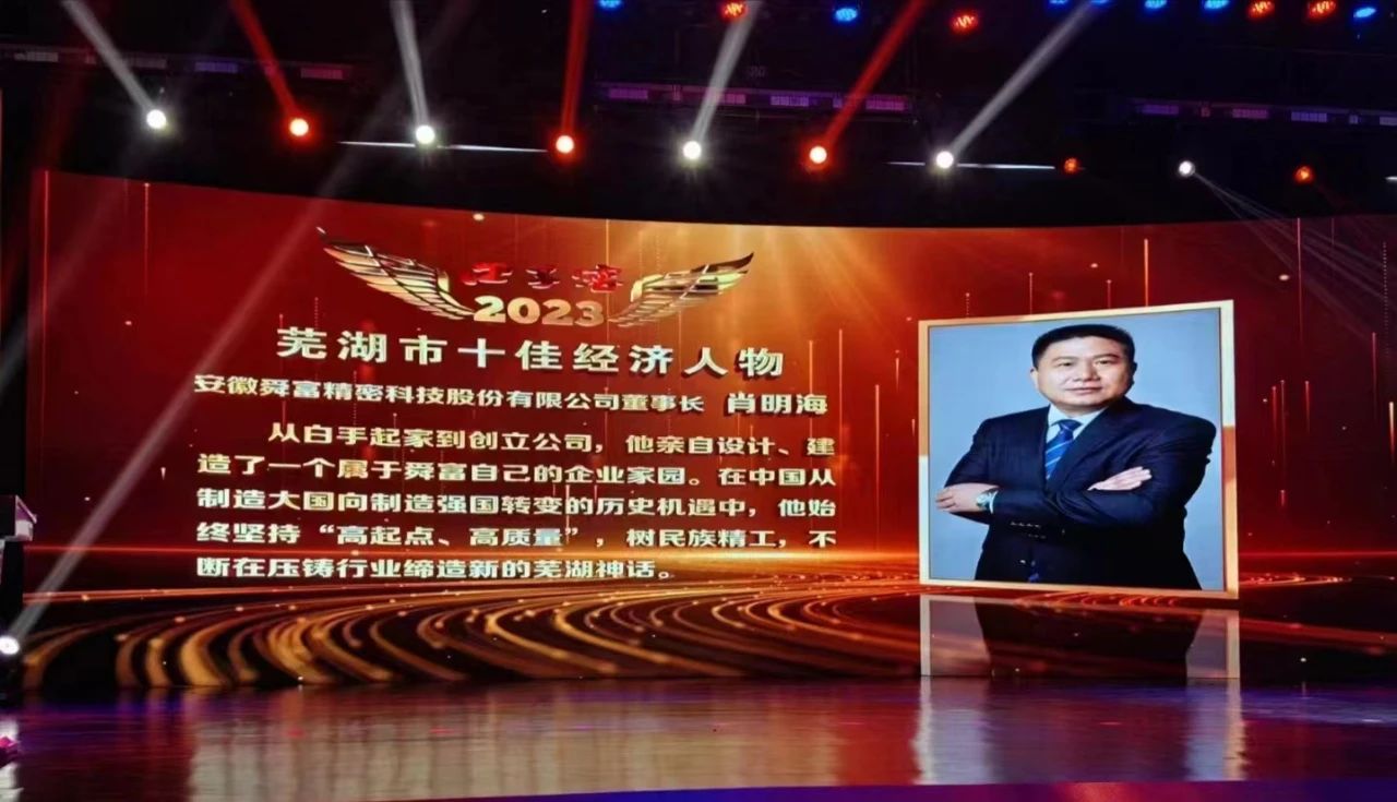 12月20日,2023年度“芜湖十佳经济人物”和2023年度“芜湖十优经济人物”的颁奖典礼在芜湖传媒中心演播大厅举行。来自南陵的安徽舜富精密科技股份有限公司董事长肖明海入选“2023年度芜湖十佳经济人物”,安徽古麒绒材股份有限公司副总经理、董秘谢伟,芜湖雅葆轩电子科技股份有限公司董事长胡啸宇入选“2023年度芜湖十优经济人物”。