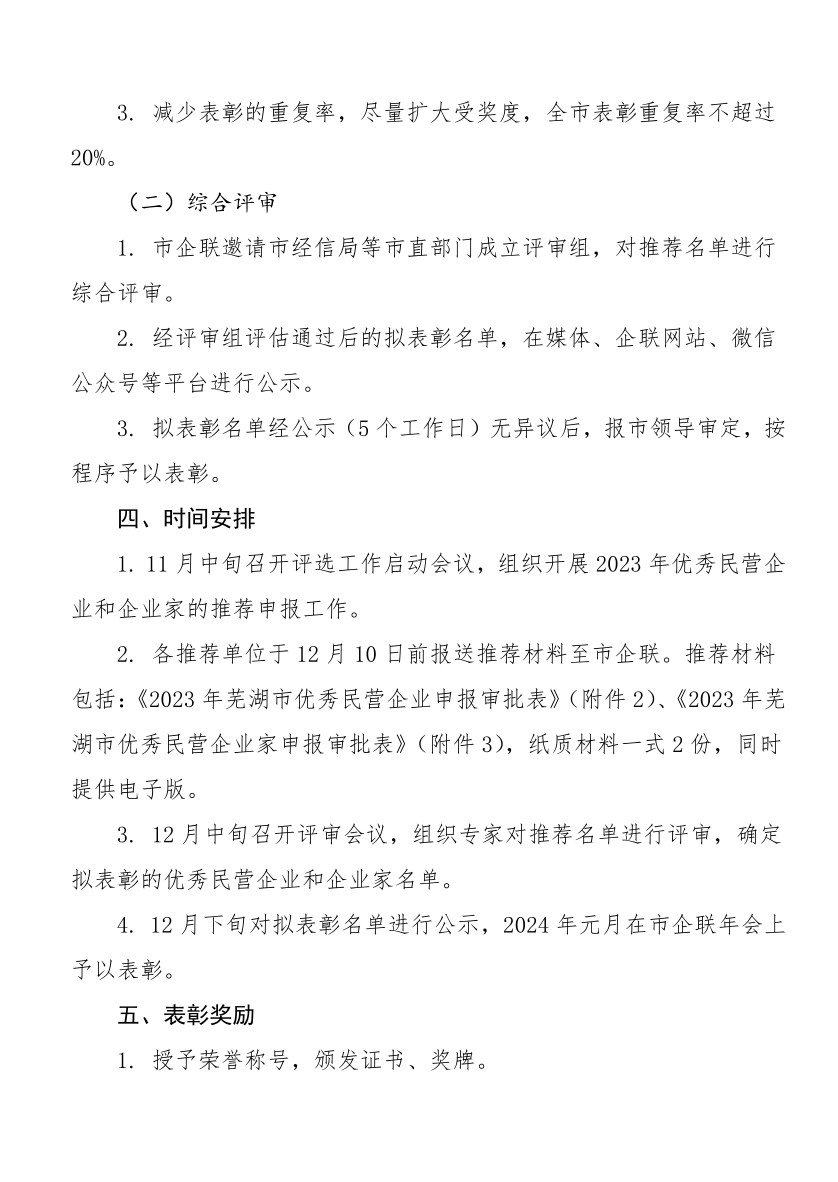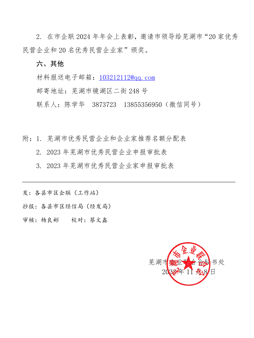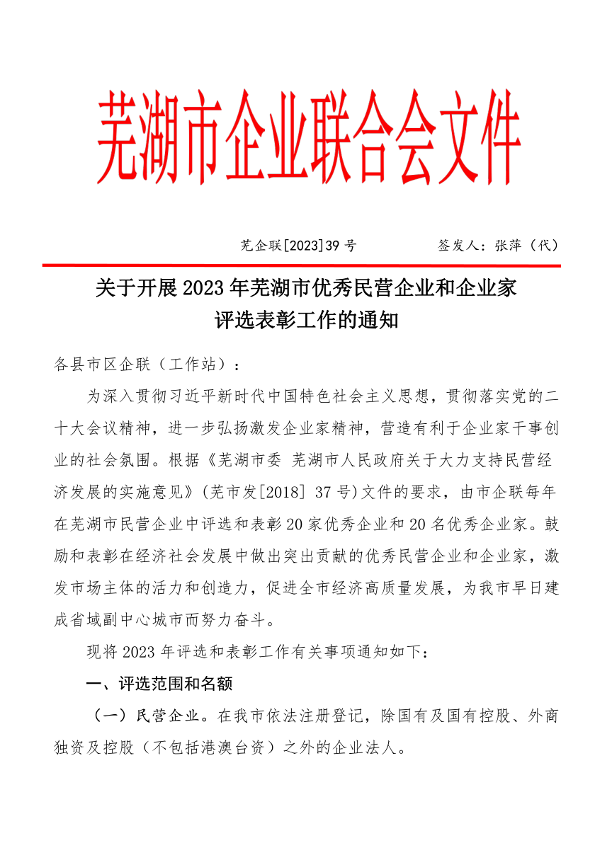 现将芜湖市企联《关于开展2023年芜湖市优秀民营企业和企业家评选表彰工作的通知》转发给大家,请根据自己情况填写申报。申报材料一式三份,纸质材料一式两份,同时提供电子版。 截止日期:2023年11月30日。