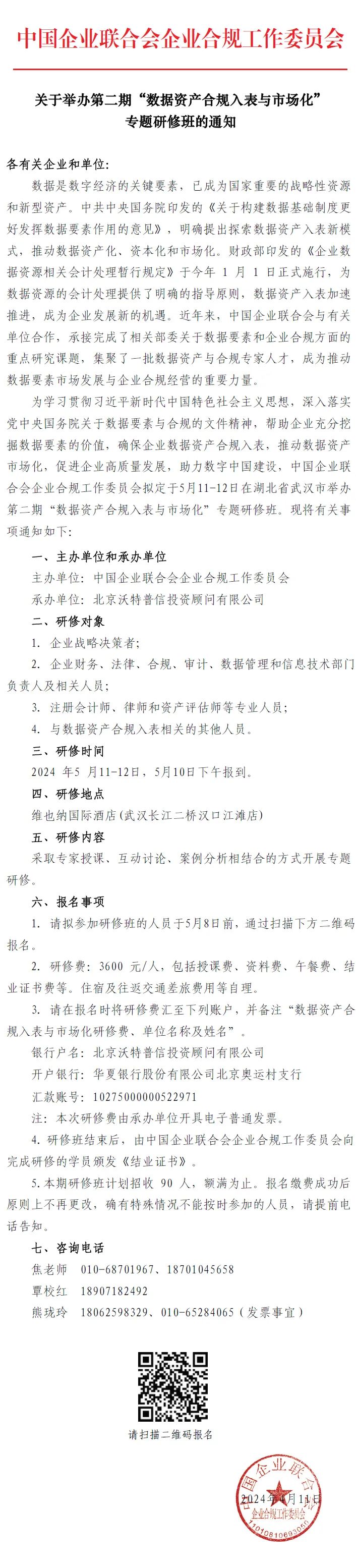 现转发中国企业联合会文件《关于举办第二期“数据资产合规入表与市场化”专题研修班的通知》。